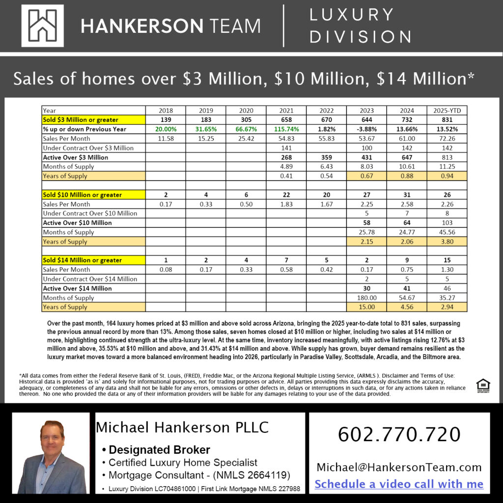 Year-to-date, 831 homes priced at $3 million and above have sold across Arizona, surpassing the previous annual record by more than 13%. This milestone confirms that demand for luxury real estate has not disappeared — it has simply become more selective.